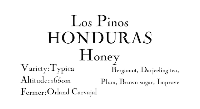 Los Pinos HONDURAS Honey Variety:Typica Altitude:1650m Fermer:Orland Carvajal Bergamot, Darjeeling tea, Plum, Brown sugar, Improve ティピカ種は古くから存在し、アラビカ原種に非常に近い品種として有名ですが、 もともと害虫に弱く、高木に育つ傾向のため収穫が難しく、扱う農園が減少し、現在はスペシャルティの農園でも収穫が少ない希少な品種です。 ロスピノス農園の農園主であるオルランド・カルバハル氏は高品質なコーヒー生産を目指す上で純度の高いティピカを選別し、さらに1600m以上の高地で丁寧に育てあげ、ホンジュラスCOEの場でも毎年のように上位入賞させることに成功しました。 オルランドさんのティピカ種は、その品質の高さから“ティピカカルバハル“と呼ばれ、現在高値で取引されています。COE受賞歴:2018.2位 、2019.6位 、2021.3位 、2022.11位 、2023.7位(2020年は開催なし) 一般的にティピカと言われるものとは一線を画すもので外観、風味ともゲイシャ種に近いものを感じますが、さらにエキゾチックなフルーツ感を併せ持ちます。 オルランドさんのティピカ種にしか無い特別な味わいを是非楽しんでください。